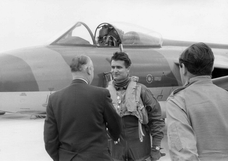 1. Dunsfold, England: Hans Häfliger is helped into his flying suit prior to a test flight in J-4001